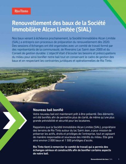Pendant plusieurs mois, Rio Tinto a mis à jour son approche de renouvellement des baux de location des terrains de la Société Immobilière Alcan Limitée (SIAL) par le biais d’un comité de travail incluant des représentants de Riverains Lac-St-Jean 2000 et d’Un Lac pour Tous.