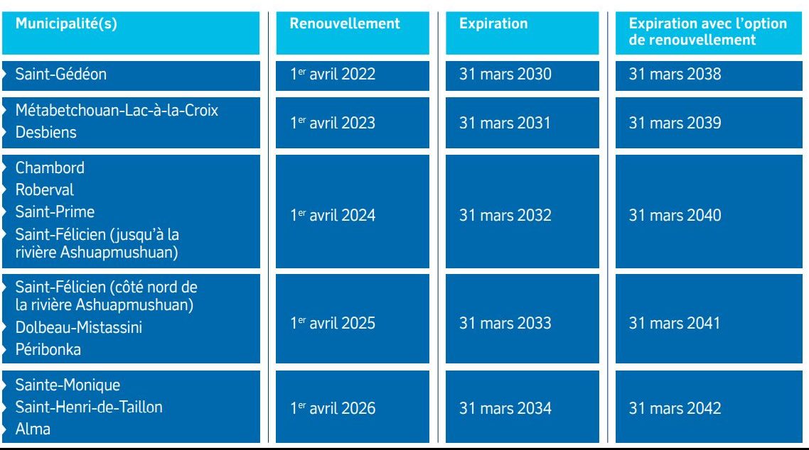 Le processus de renouvellement des cinq secteurs se déroulera de 2022 à 2027, en commençant par le secteur de Saint-Gédéon en mars 2022. Ces derniers recevront les documents pour renouveler leur bail dès janvier 2022.