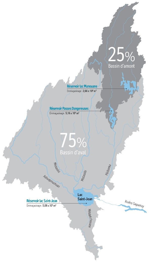 La majeure partie de l’eau qui tombe sur les bassins hydrographiques ruisselle jusqu’aux grands réservoirs du lac Manouane et de Passes-Dangeureuses, appelés communément réservoirs d’amont, ou dans le lac Saint-Jean. Cette arrivée d’eau constitue les apports naturels et l’eau emmagasinée sert à alimenter les centrales hydroélectriques de Rio Tinto.